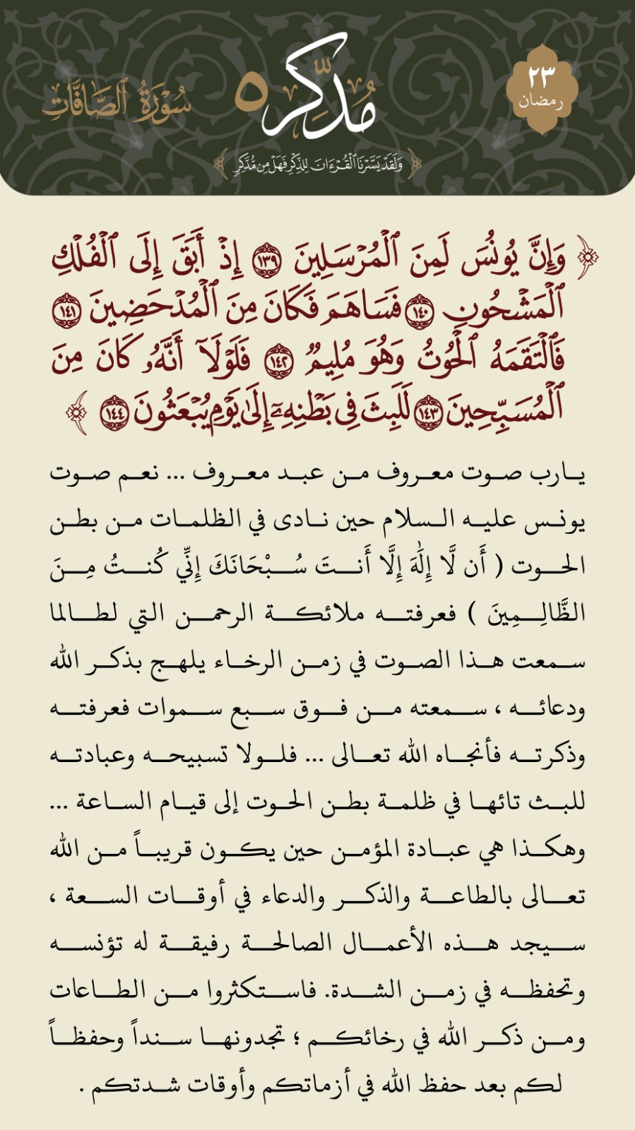 - ﴿فَلَوْلَا أَنَّهُ كَانَ مِنَ الْمُسَبِّحِينَ ﴿١٤٣﴾ ﴾ [الصافات آية:١٤٣]