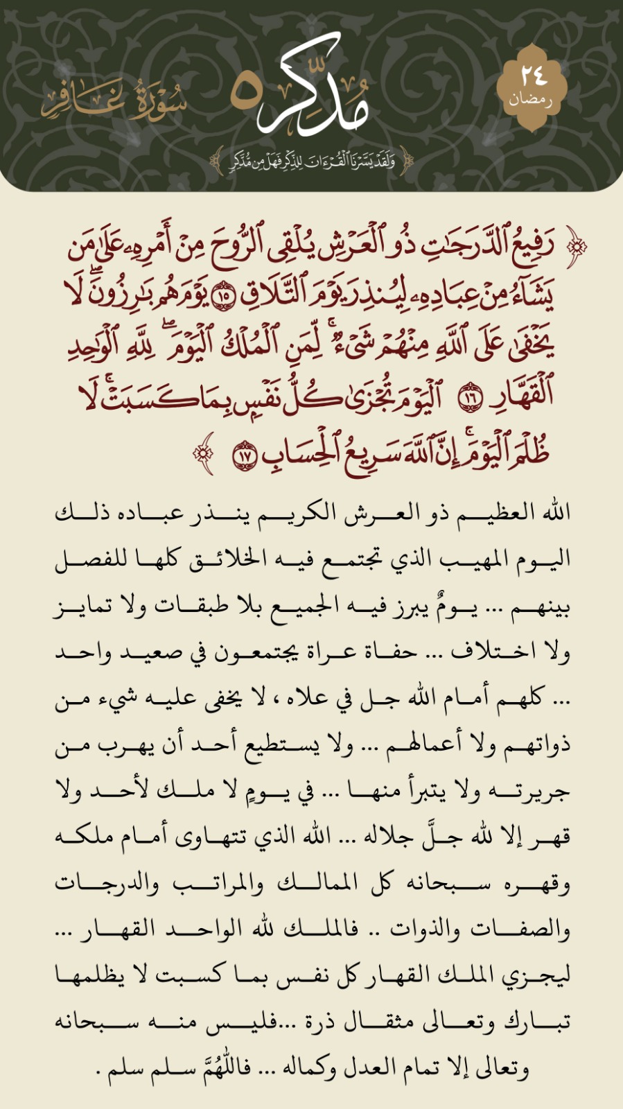 ﴿رَفِيعُ الدَّرَجَاتِ ذُو الْعَرْشِ يُلْقِي الرُّوحَ مِنْ أَمْرِهِ عَلَى مَن يَشَاءُ مِنْ عِبَادِهِ لِيُنذِرَ يَوْمَ التَّلَاقِ . يَوْمَ هُم بَارِزُونَ لَا يَخْفَى عَلَى اللَّهِ مِنْهُمْ شَيْءٌ لِّمَنِ الْمُلْكُ الْيَوْمَ لِلَّهِ الْوَاحِدِ الْقَهَّارِ . الْيَوْمَ تُجْزَى كُلُّ نَفْسٍ بِمَا كَسَبَتْ لَا ظُلْمَ الْيَوْمَ إِنَّ اللَّهَ سَرِيعُ الْحِسَابِ﴾