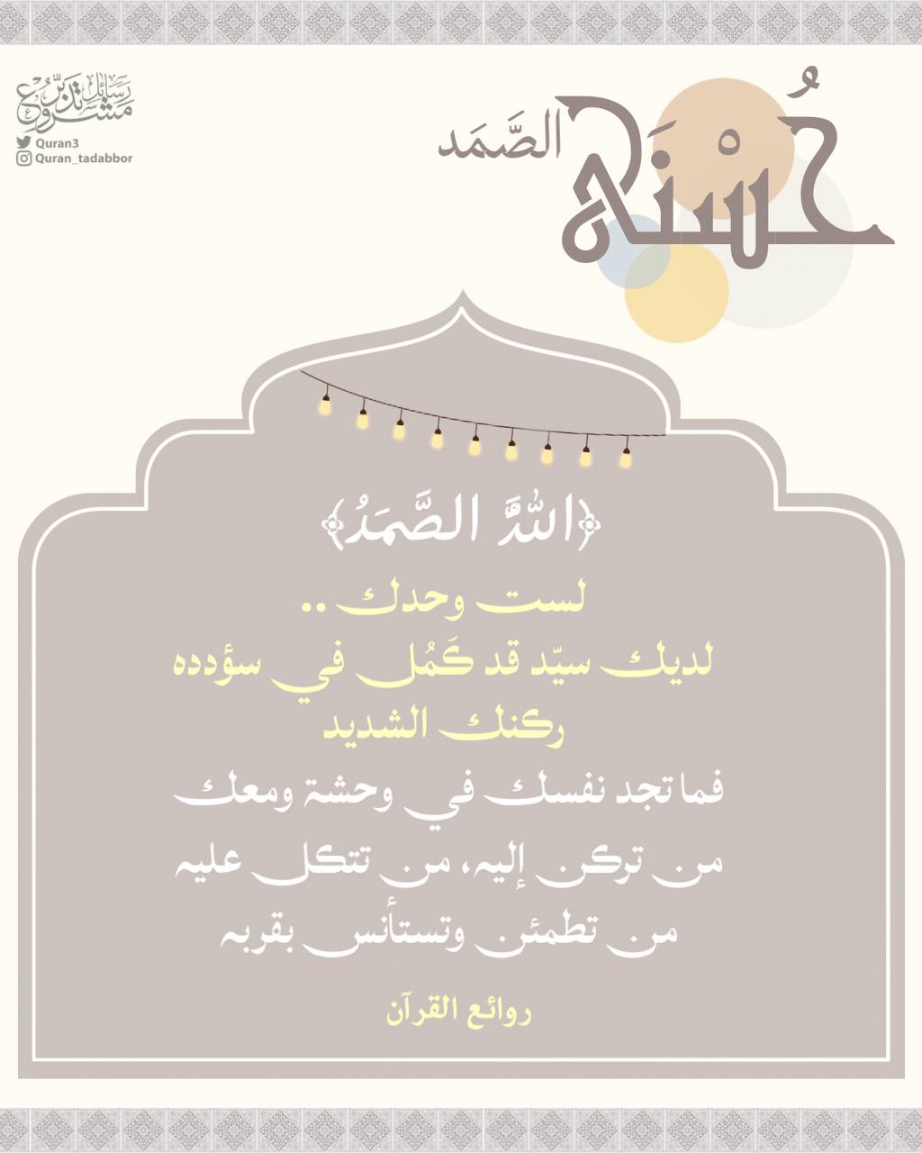 ♦️ حسنىٰ .. ( الصمد ) ﴿اللَّهُ الصَّمَدُ﴾ لست وحدك .. لديك سيّد قد كَمُل في سؤدده، ركنك الشديد، فما تجد نفسك في وحشة ومعك من تركن إليه، من تتكل عليه، من تطمئن وتستأنس بقربه.