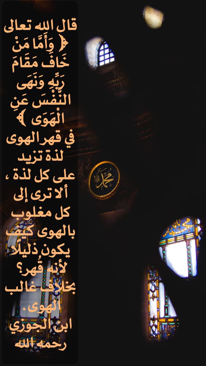 قال الله تعالى: ﴿وَأَمَّا مَنْ خَافَ مَقَامَ رَبِّهِ وَنَهَى النَّفْسَ عَنِ الْهَوَى﴾ • في قهر الهوى لذة تزيد على كل لذة ، ألا ترى إلى كل مغلوب بالهوى كيف يكون ذليلا لأنه قُهر؟ بخلاف غالب الهوى.