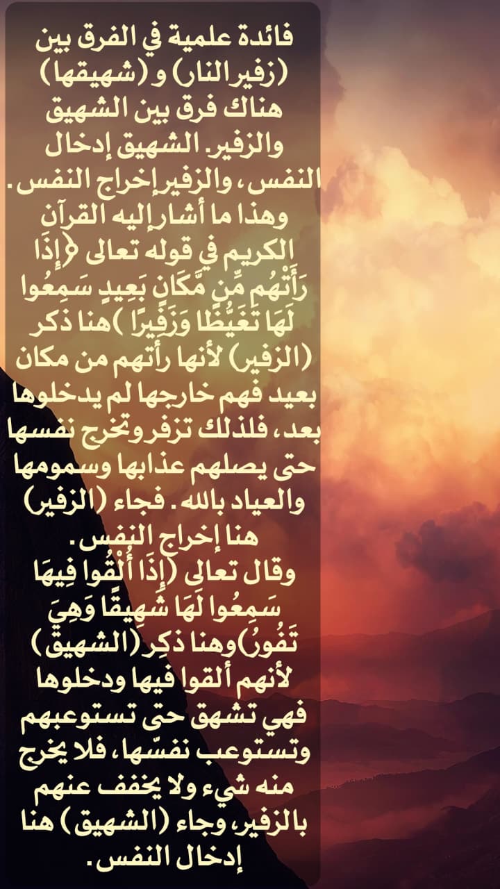 (إِذَا أُلْقُوا فِيهَا سَمِعُوا لَهَا شَهِيقًا وَهِيَ تَفُورُ) وهنا ذكر (الشهيق ) لأنهم ألقوا فيها ودخلوها فهي تشهق حتى تستوعبهم وتستوعب نفسها، فلا يخرج منه شيء ولا يخفف عنهم بالزفير، وجاء (الشهيق ) هنا إدخال النفس.